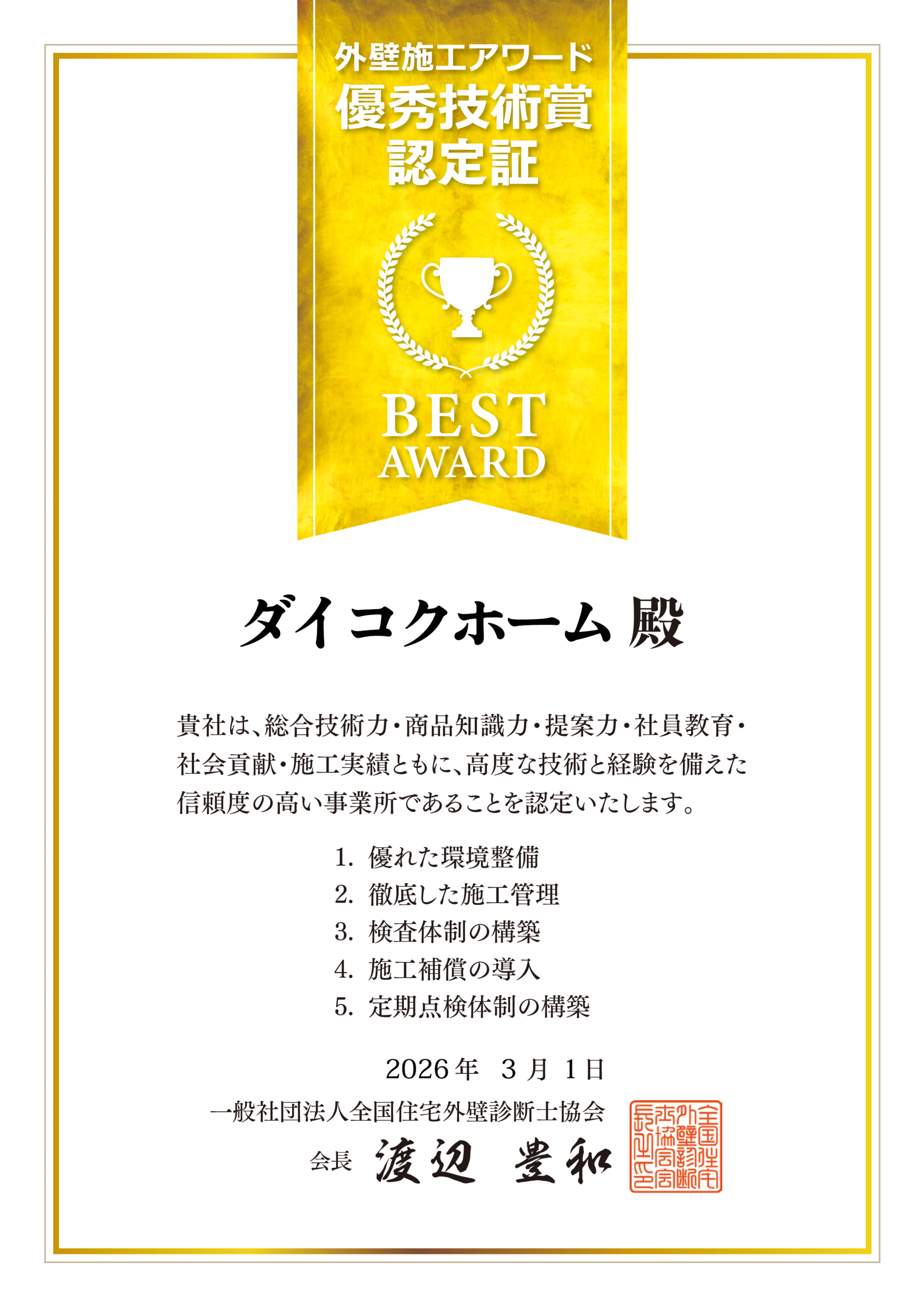 - ダイコクホームでは、外壁塗装・修繕工事において高い施工技術と経験を活かし、細部まで丁寧な作業を徹底しています。